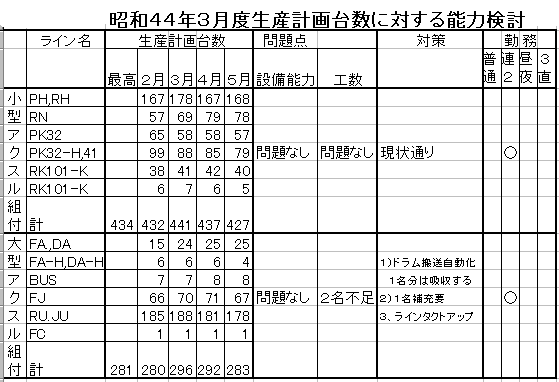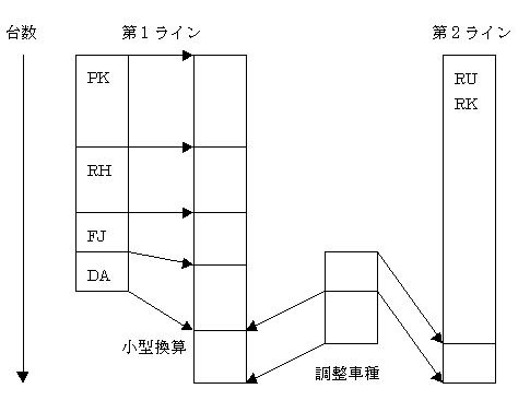 又、毎日生産するだけの台数がない車型や仕様の車は、一定の間隔をおいて生産するようにする、この条件はよく見落されがちであるが、平均化のためには重要な条件である。