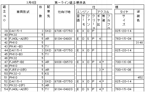 ・第2ラインの組立順序表より順序に従って車種を入れていく。