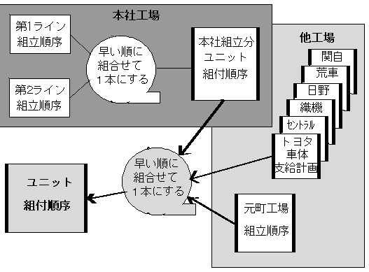 旬間計画により10日単位で与えられた車型別の生産台数を、車種ごとでも、車型ごとでも、ユニットの種類ごとでも、特殊な仕様ごとでも、毎日の生産台数がてきる限り均等になるように作成する。